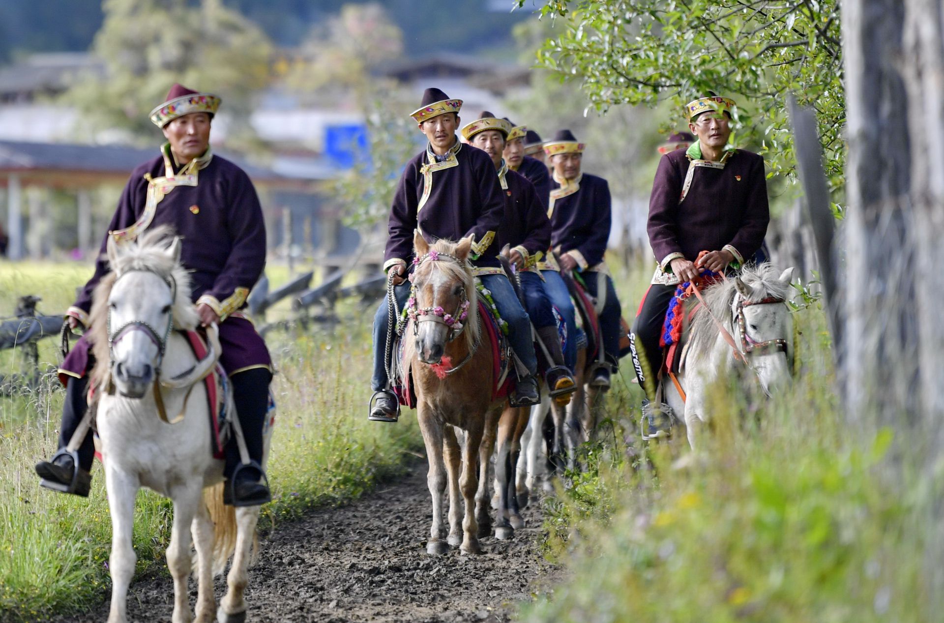 农牧民在鲁朗旅游小镇骑行。