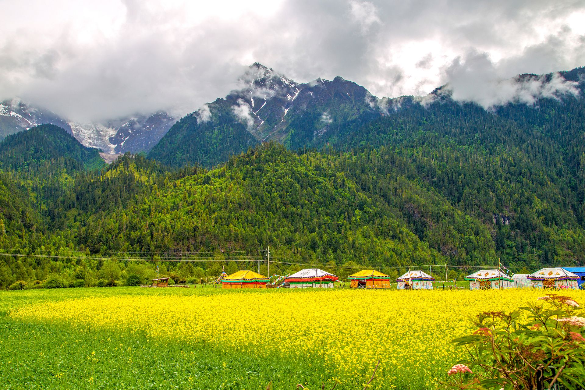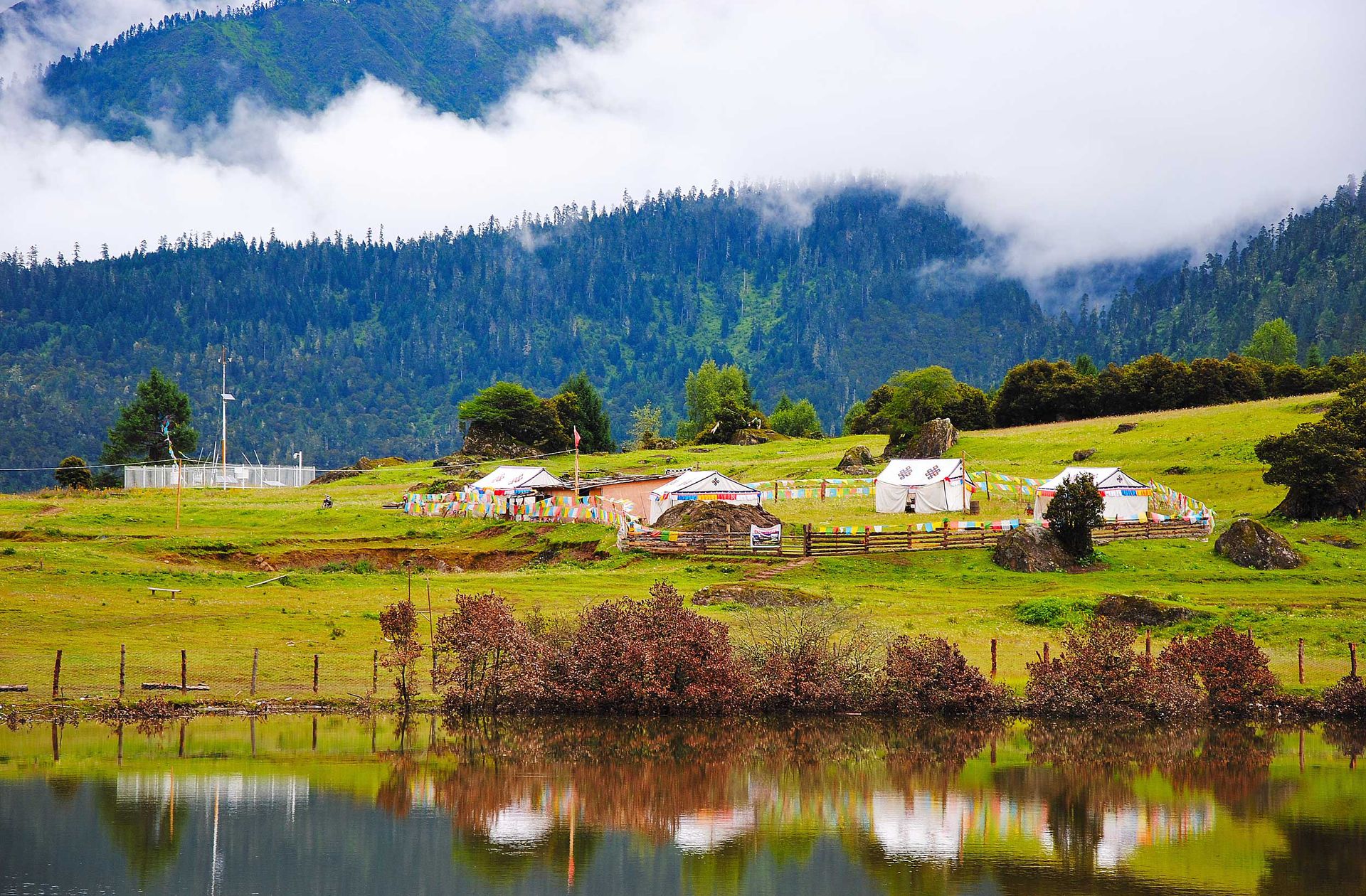 小镇是一片典型高原山地草甸狭长地带,长约15公里,平均宽约1公里。两侧青山由低往高分别由灌木丛和崐茂密的云杉和松树组成“鲁朗林海”。