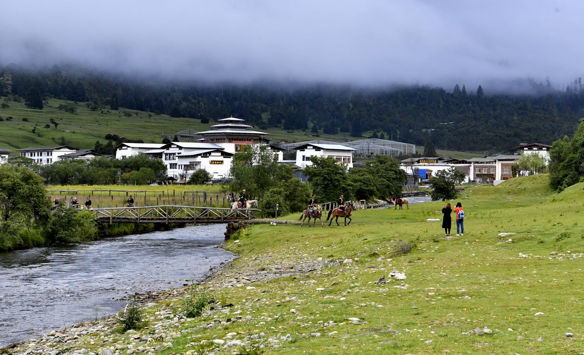 盛夏时节,西藏林芝市鲁朗旅游小镇气候宜人,成为游客休闲避暑的“天堂”。