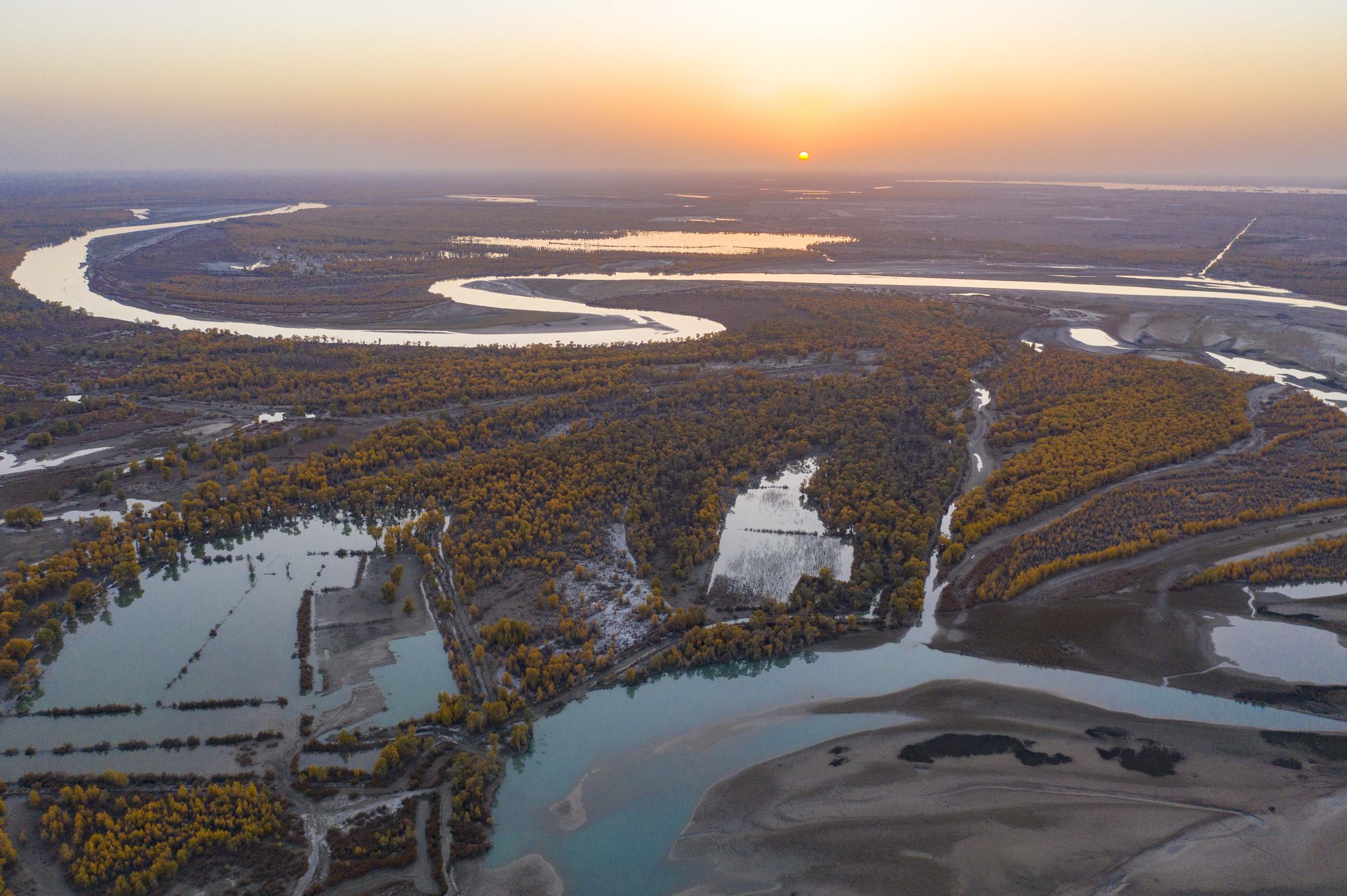 这是在新疆阿克苏地区拍摄的夕阳下的塔里木河沿岸胡杨林景观。