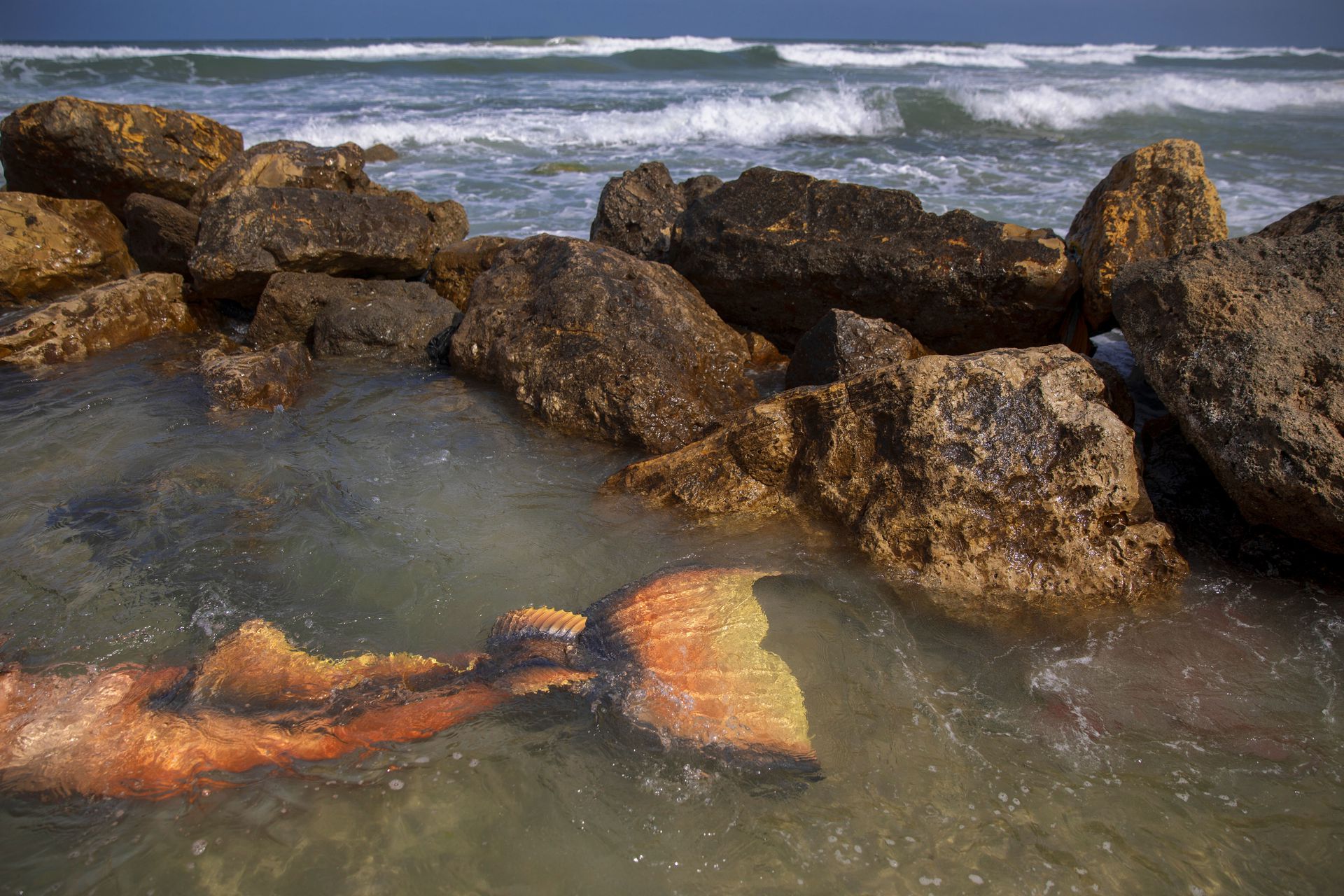 2020年5月23日,在以色列特拉维夫附近的巴特亚母海滩上,一名美人鱼社区的成员戴着一条美人鱼尾巴,与大海和岩石构成一幅神奇的画面。