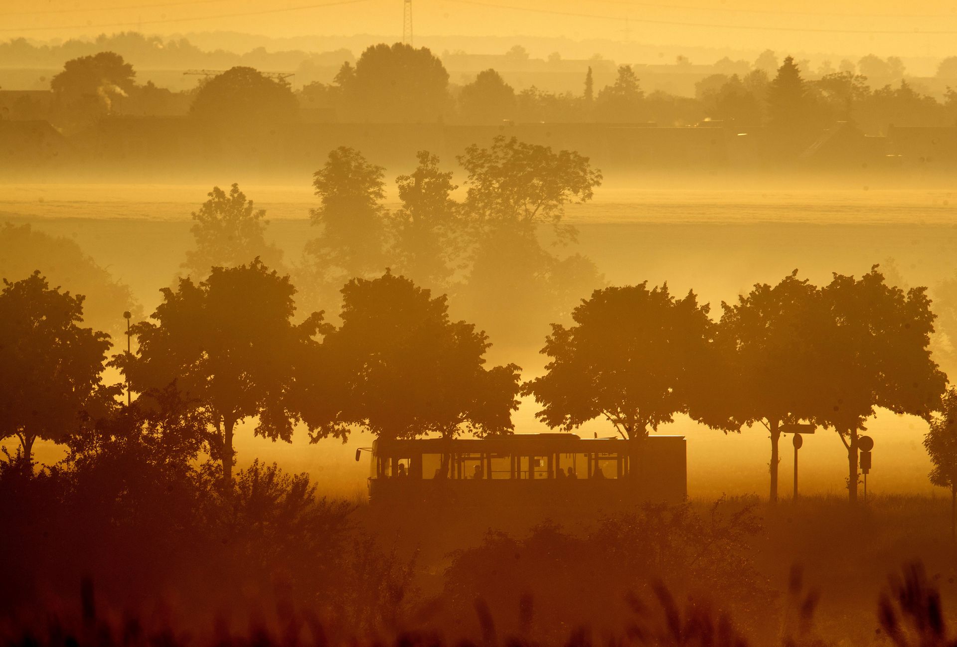 2020年6月19日,在德国法兰克福,一辆公交车在日出中行驶。