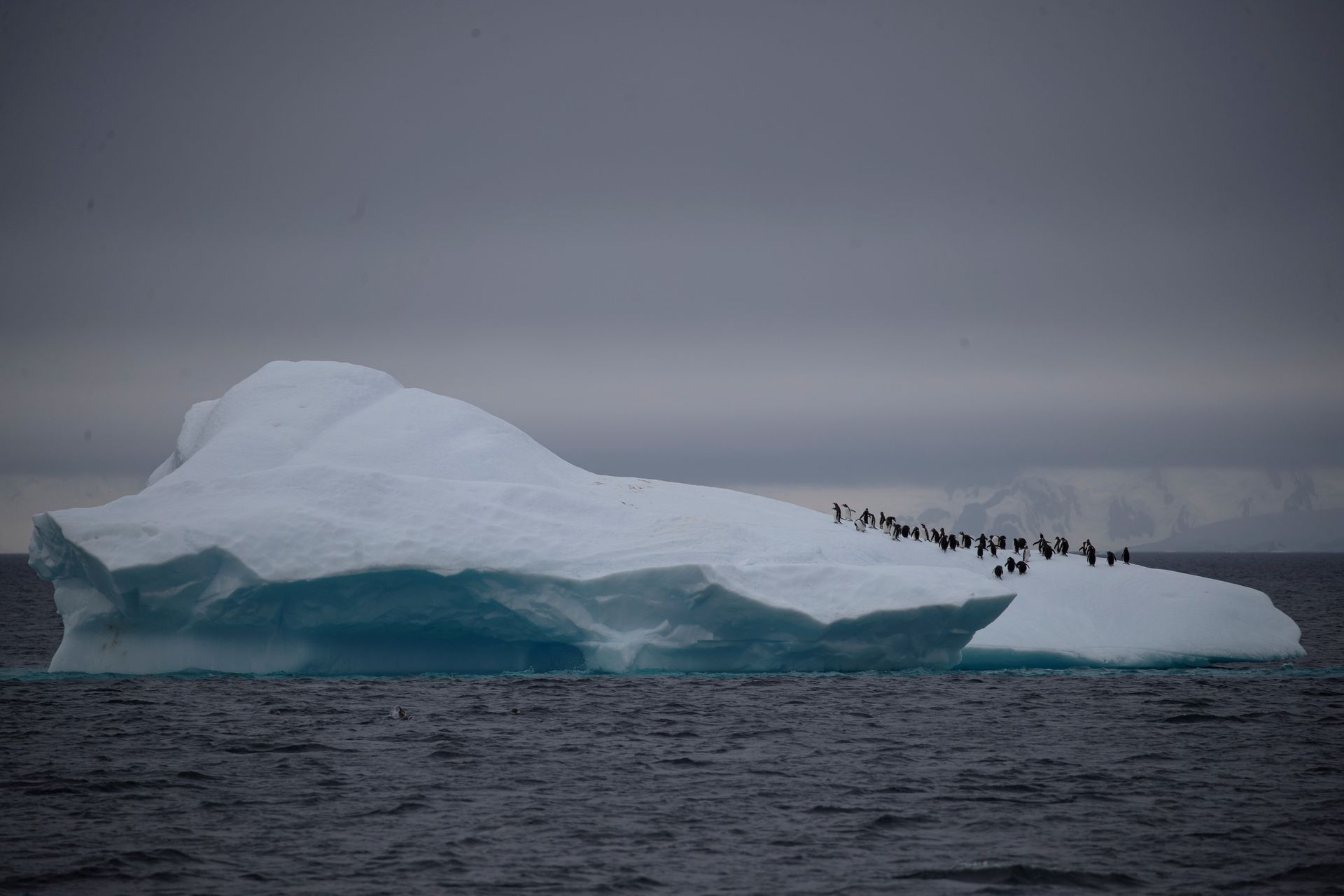 2020年2月6日,在南极洲勒梅尔海峡附近,一群企鹅行走在漂浮的冰山上。