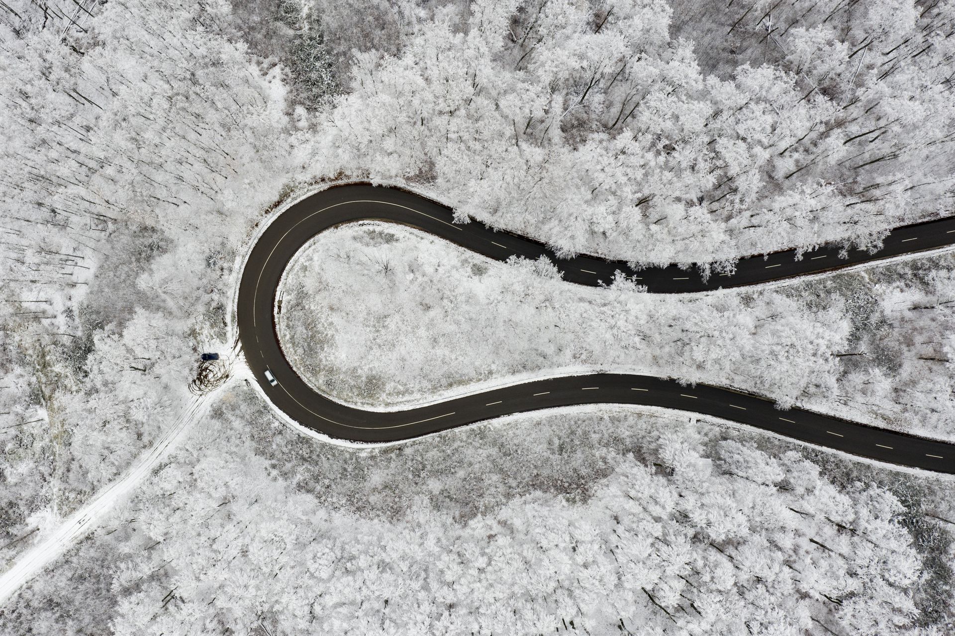 2020年11月30日,在匈牙利马特拉山脉的帕拉萨瓦附近,大雪和白霜覆盖了树林,公路形成了一个完美的弧度。