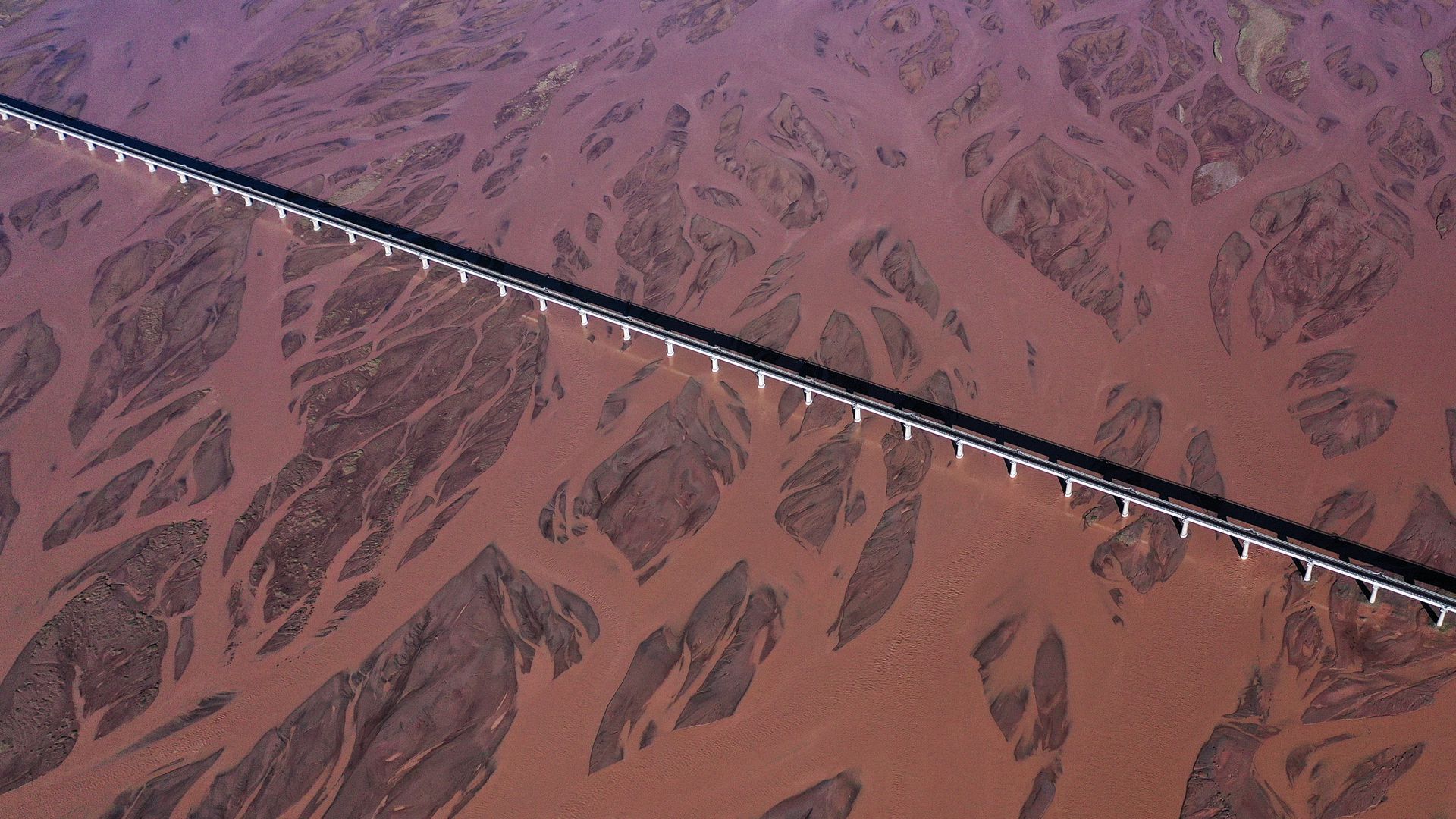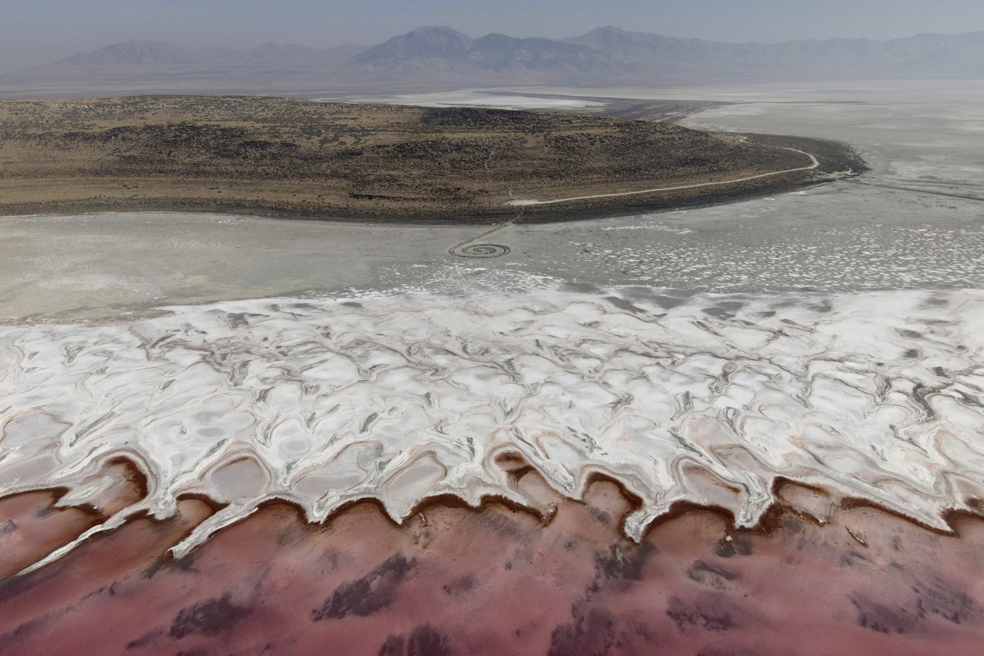 2020年10月8日,在美国犹他洲豪厄尔市,大盐湖岸边的螺旋码头附近出现了红色的色调。