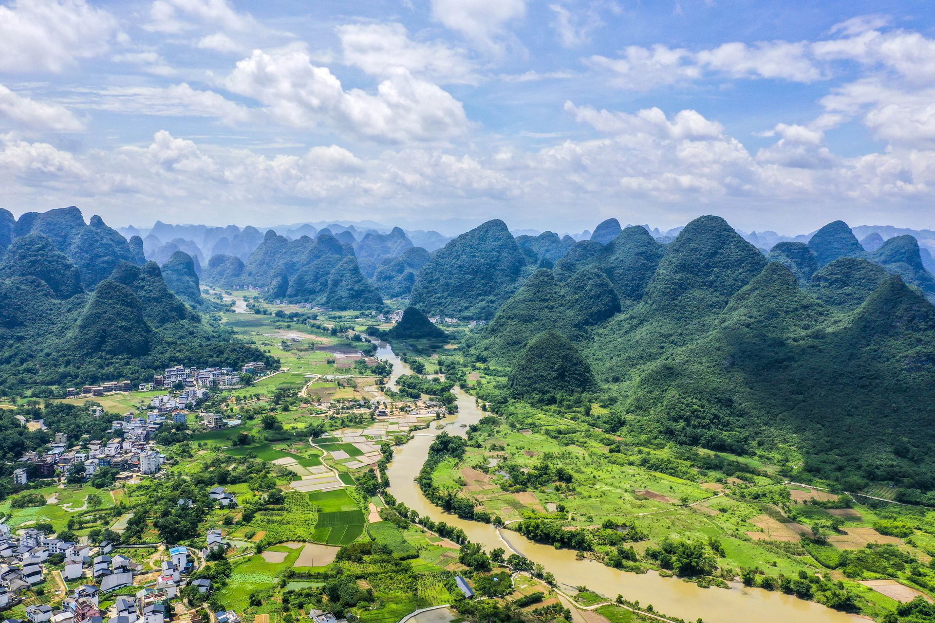 2020年7月4日,中国广西桂林市阳朔县,景色秀丽,青山绿草,蓝天白云构成一幅美丽的山水画卷。