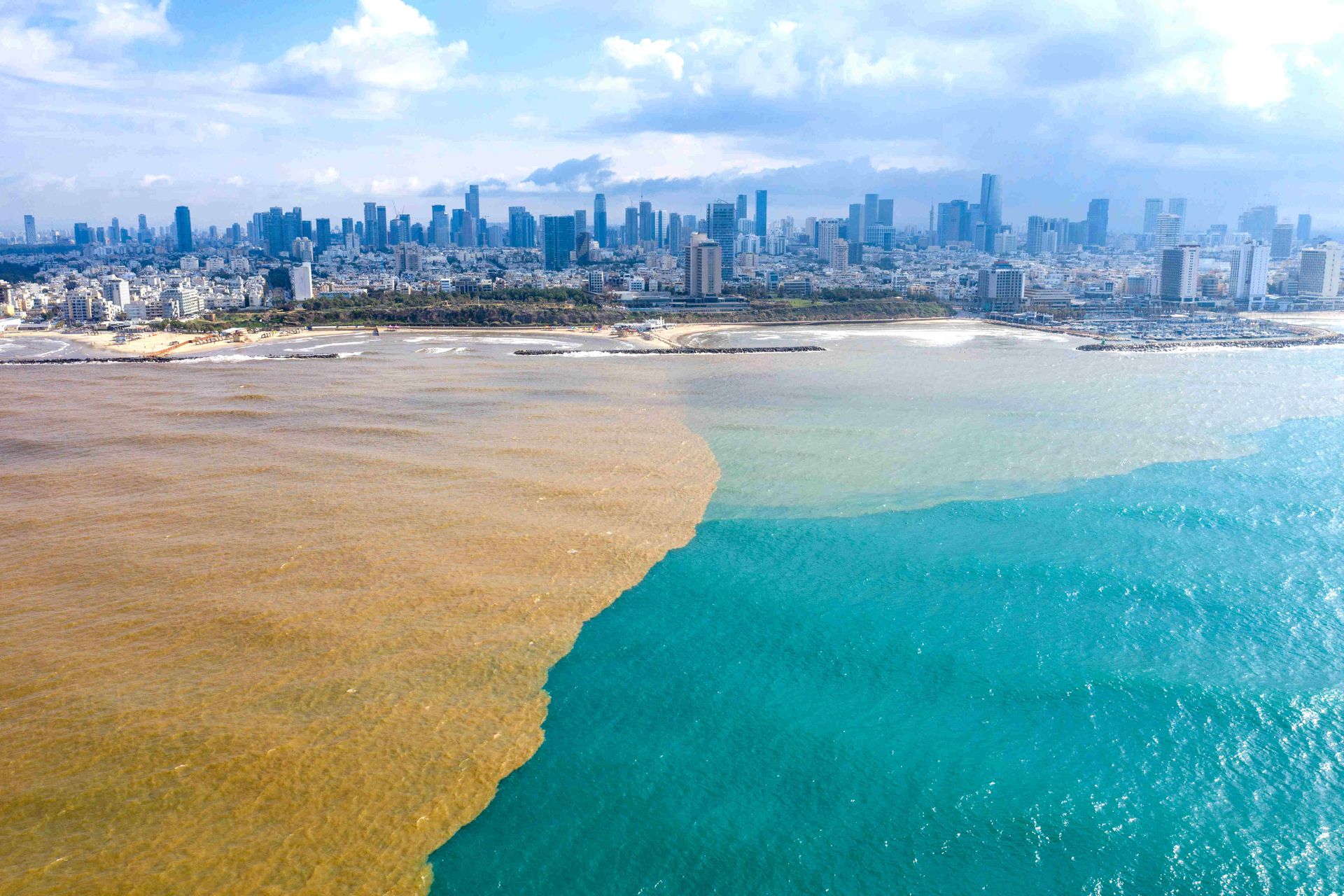 2020年1月22日,来自雅孔河的泥水流入以色列特拉维夫的地中海,呈现出界限清晰的“阴阳河”奇观。