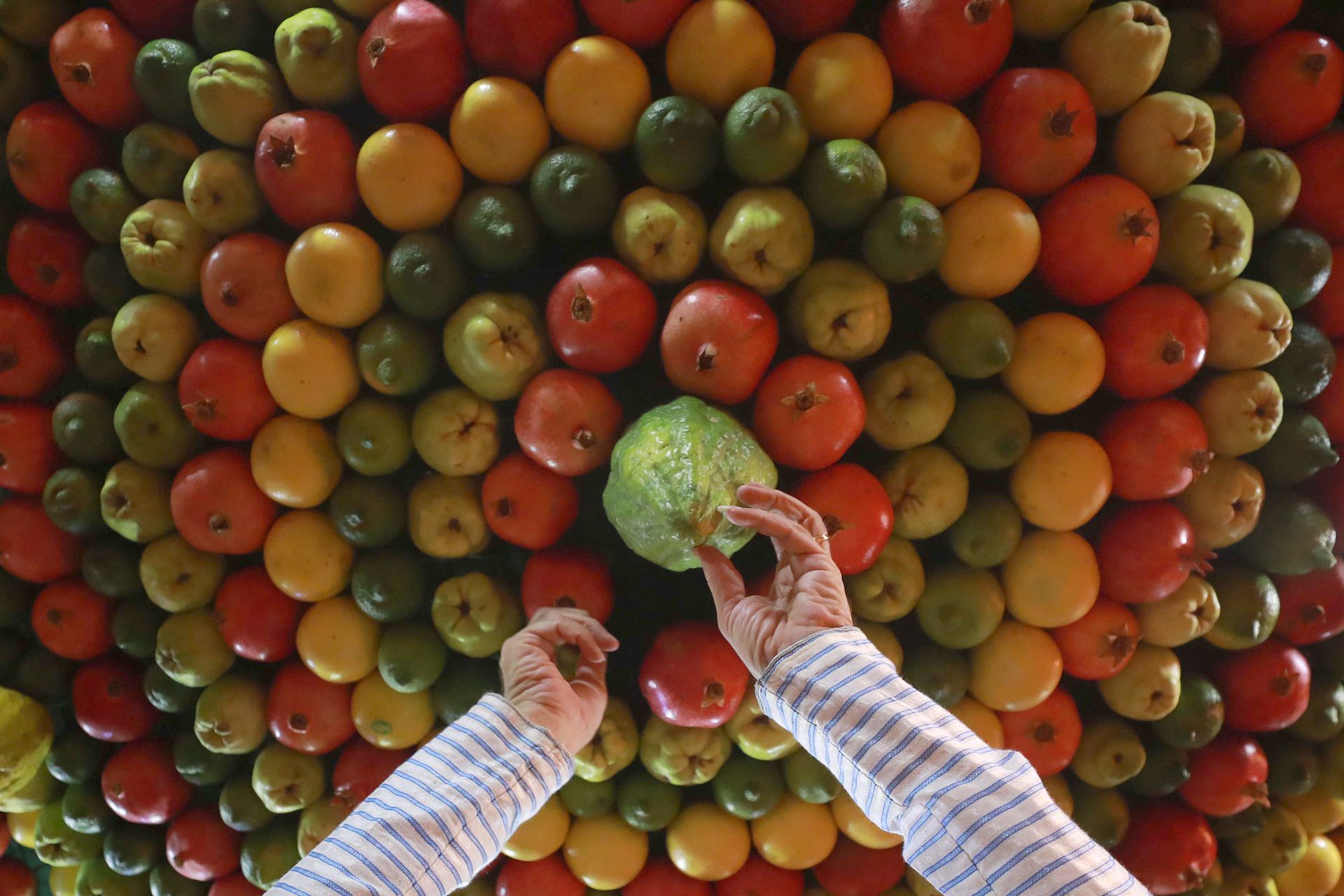 2020年10月30日,在约旦河西岸纳布卢市,住棚节(犹太教的节日)将至,撒马利亚人在房间内用水果搭起棚子。