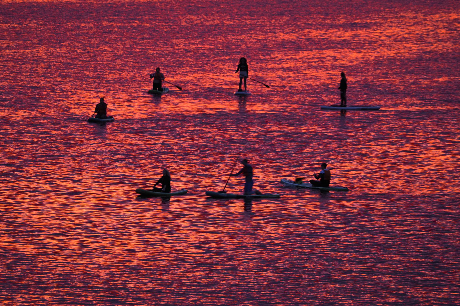 2020年7月6日,俄罗斯圣彼得堡,西南300公里的普斯科夫,人们在日落时驾驶着站立式桨板。