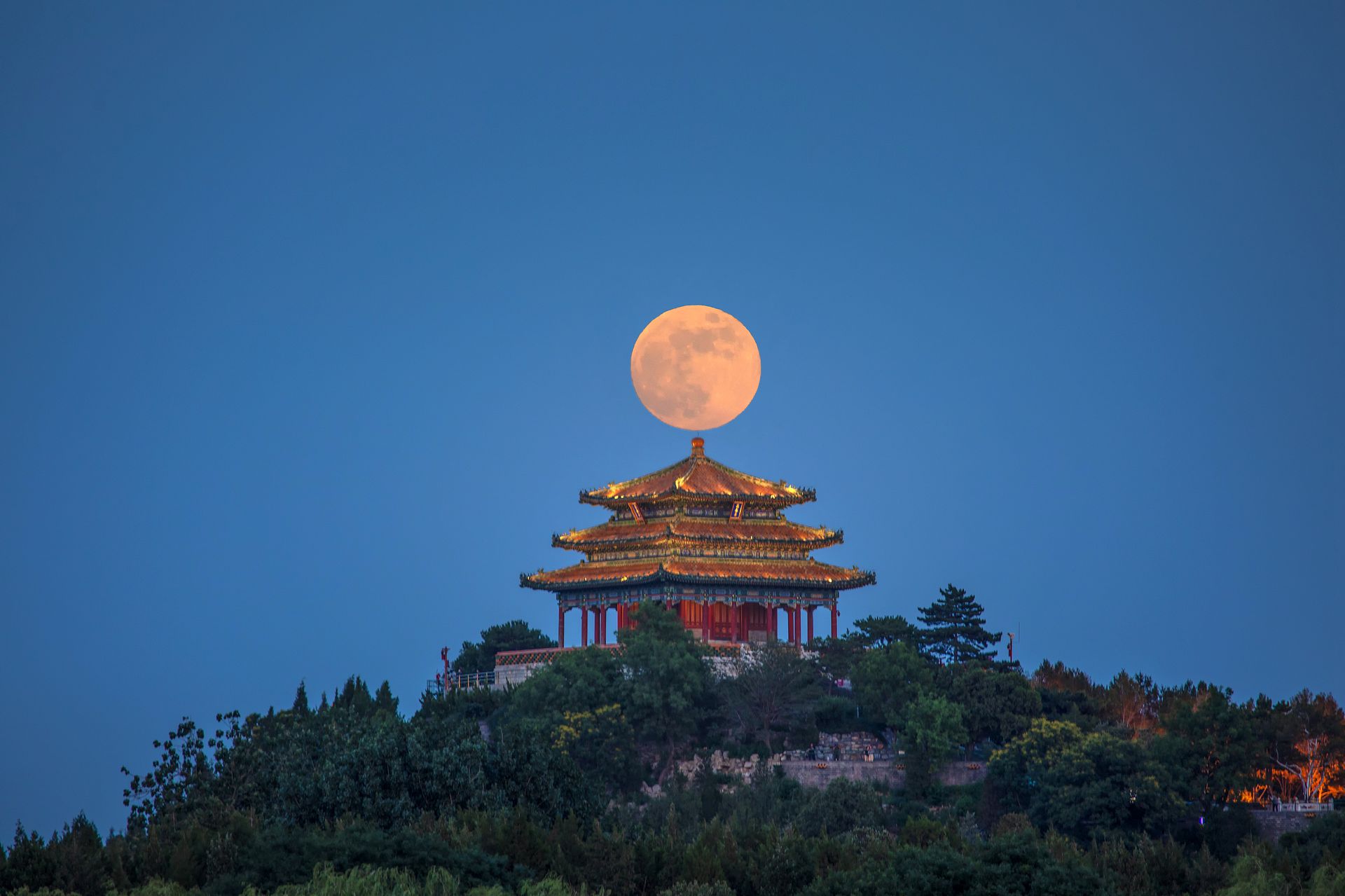 2020年6月15日,在中国北京的北海公园眺望景山万春亭,月亮在万春亭顶上高高挂起。
