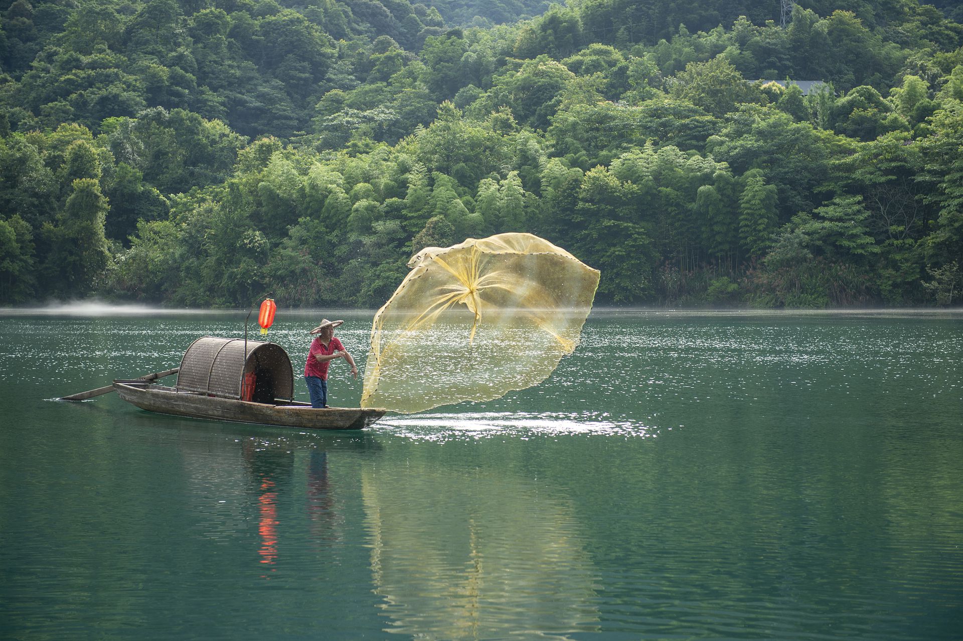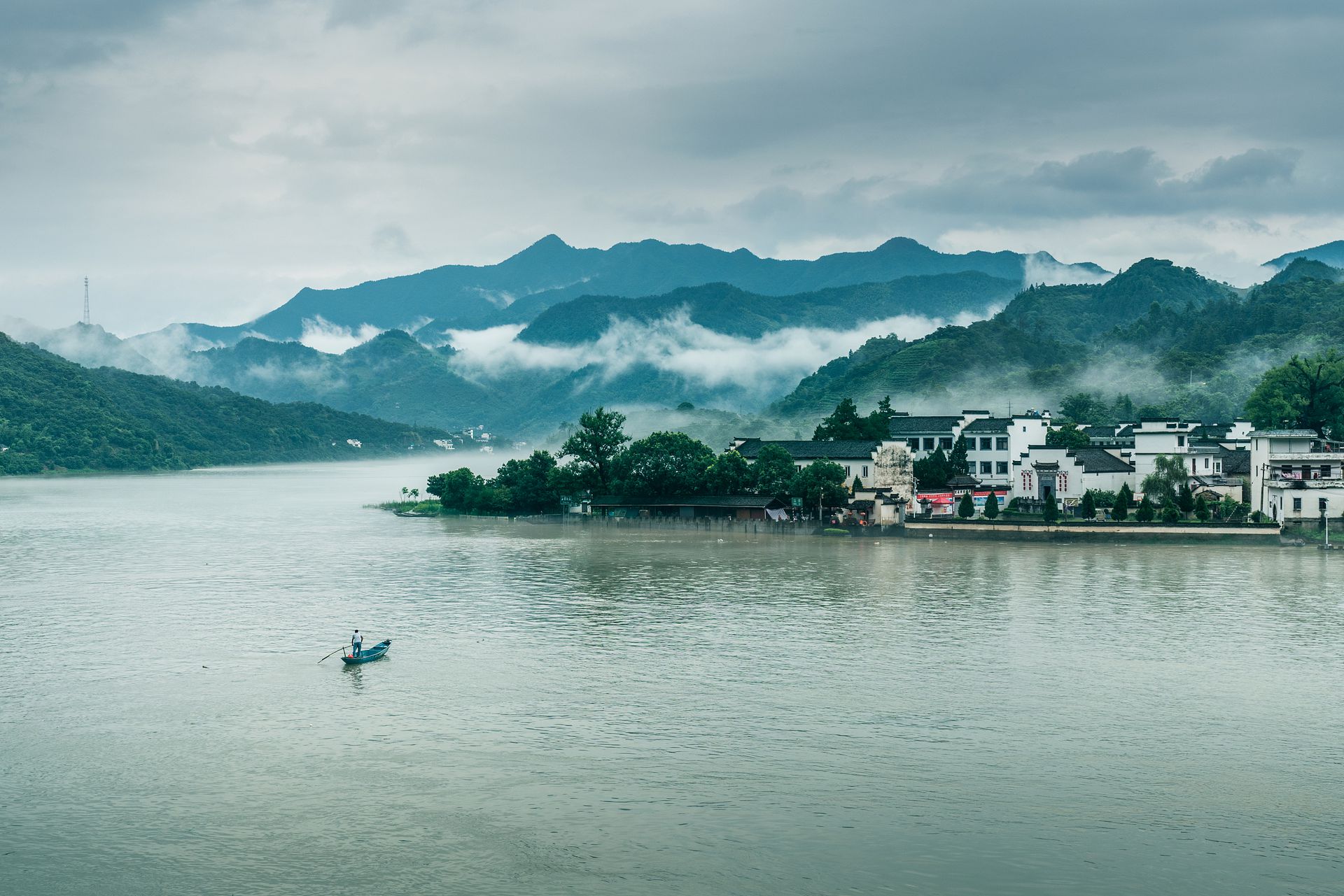 2020年7月5日,中国安徽黄山,新安江讯期来临,水面云雾缭绕如仙境。