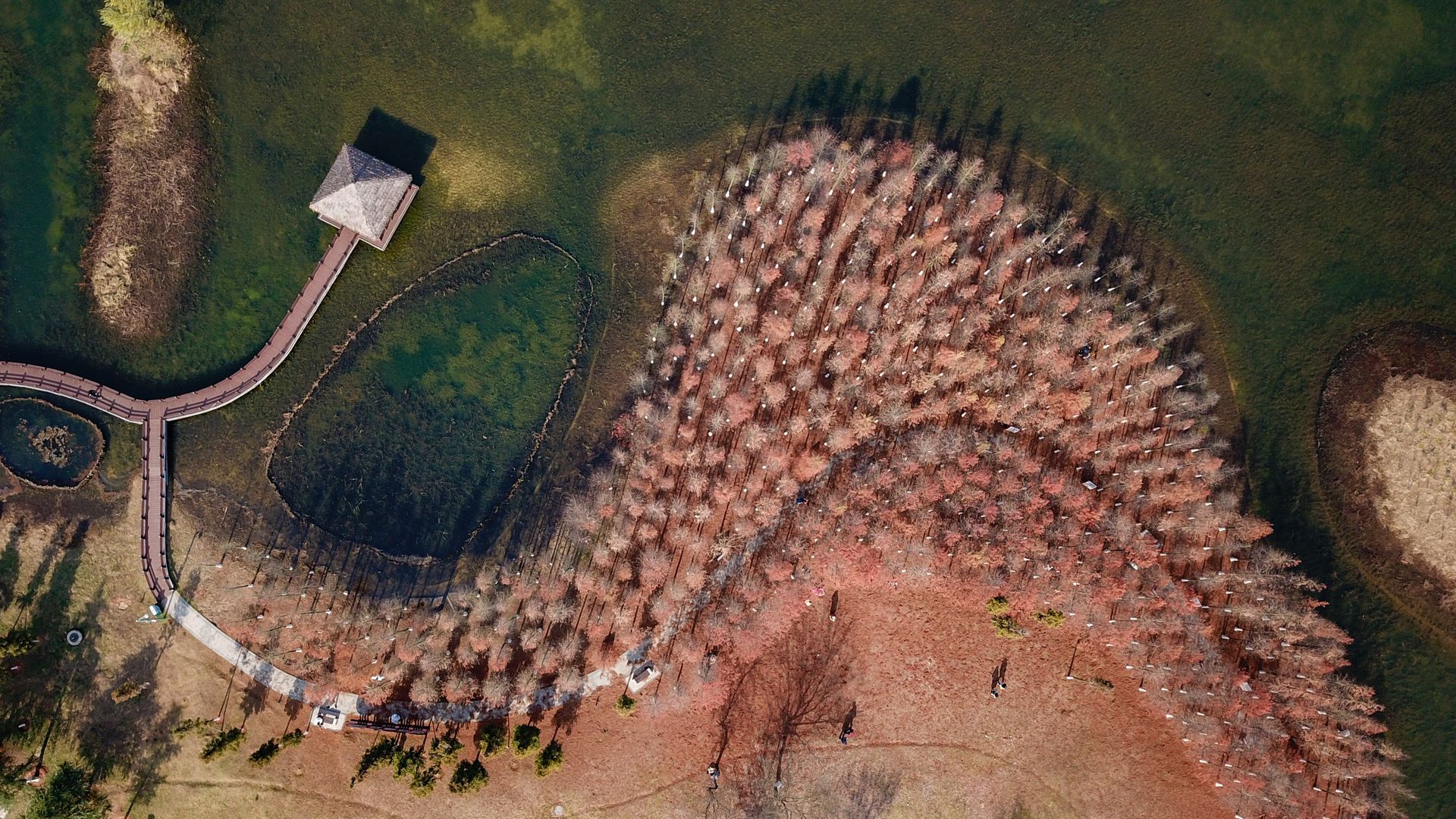 2020年12月30日,位于中国湖南省长沙市长沙县的湖南松雅湖国家湿地公园的水杉树叶变色,将公园装扮成一幅美丽画卷,吸引市民前往观赏。