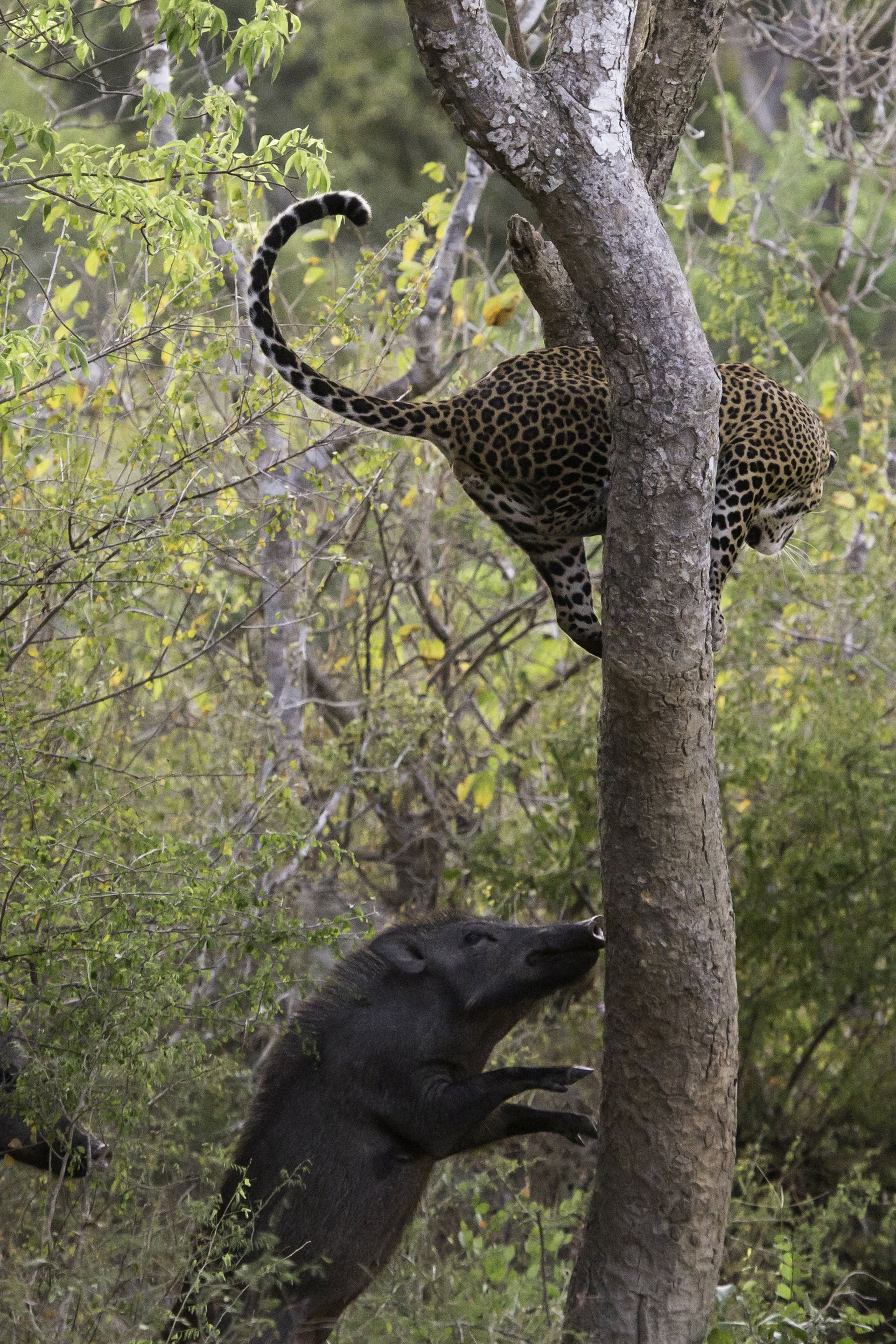 斯里兰卡Yala国家公园,这张令人惊叹的照片展示了一个捕猎者和猎物者身份的置换,一头野猪将一头受到惊吓的猎豹追到了树上。这头猎豹在去往水坑的路上,遇到一只正在觅食的野猪,野猪直接进入了攻击模式,向猎豹冲去。猎豹迅速跑离,愤怒的野猪在后面穷追不舍,猎豹跳到了树上才最终躲过了野猪的獠牙。