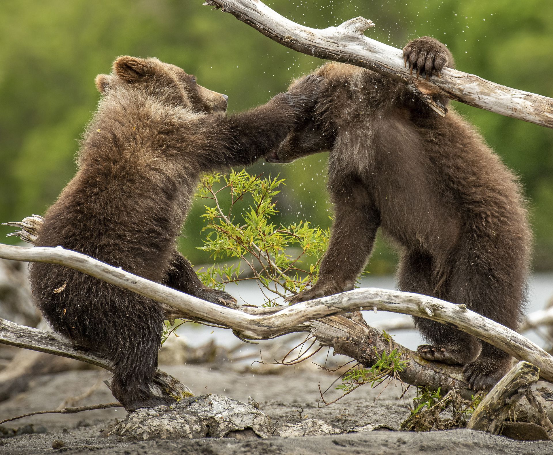 俄罗斯堪察加半岛,两头幼熊打架的画面十分诙谐有趣,对于其中一头不幸的小熊来说,看似深情的亲吻般的爱抚换来一个结实的巴掌。但两者依然是很好的朋友,平静下来后一起散步,一起在妈妈身边游荡。