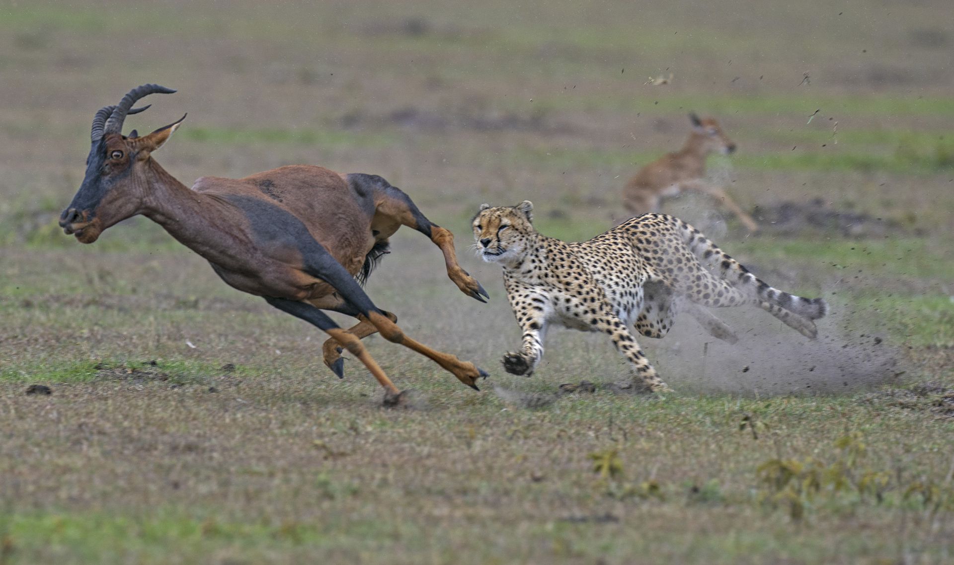 肯尼亚马赛马拉自然保护区,饥饿的猎豹在肯尼亚大草原上以闪电般的速度向猎物猛扑过去。猎豹联盟猎杀了一头转角牛羚,他们似乎认为转角牛羚比速度极快的瞪羚更容易捕获。
