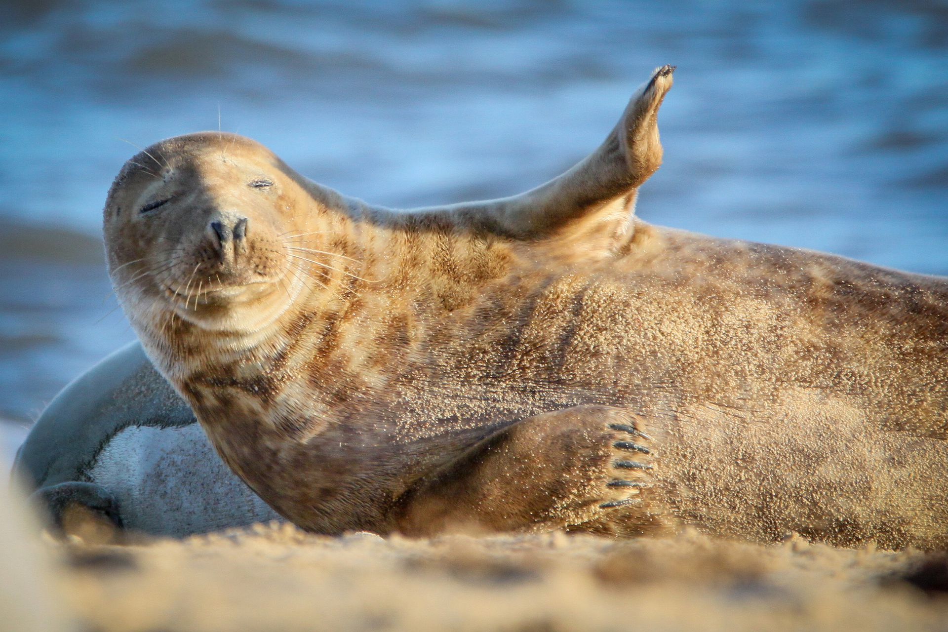 英国诺福克郡霍尔西海滩,36岁的Laura Lake拍摄到一张照片,一只海豹举起它的鳍,好像在说:“别和我说,和鳍说话吧。”Laura Lake表示,“好像看到了一只有态度的海豹。它似乎厌倦了一些人或者一些事,好似举起自己的手说,和手说话吧。我很喜欢这张图片,它真实地展示了一只灰色海豹的习性和性格。”