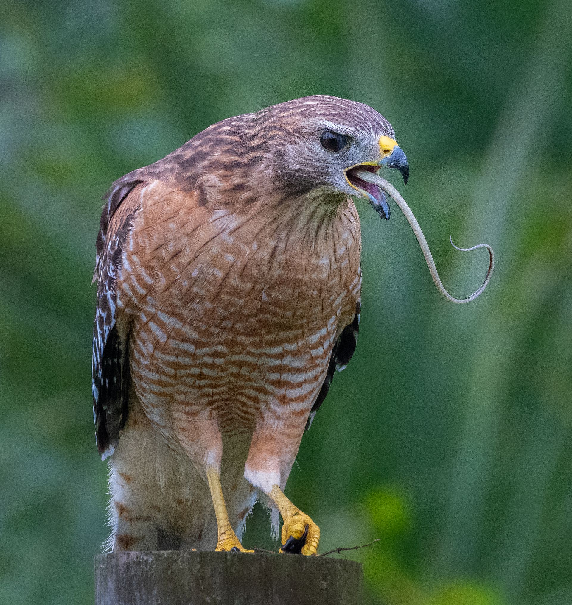 美国佛罗里达州,一只鹰吞下一条蛇,使它看起来好像有一条长长的舌头。这只鹰从篱笆上跳下来抓住蛇,令人印象深刻地把它整个吞了下去。摄影师Liwen Tao拍摄到这一幕,他表示:“当时那只鹰站在篱笆上,打量着这片区域。”