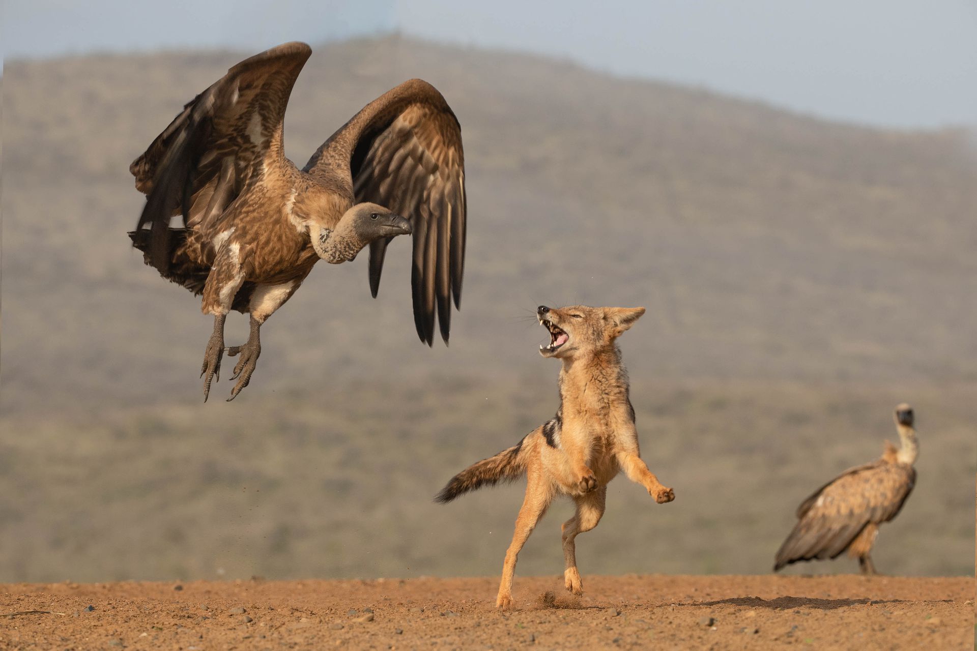 南非齐曼加私人野生动物保护区,照片显示了在南非野生动物保护区,豺狼和秃鹫之间的激烈争斗,这些野兽正在争夺食物。