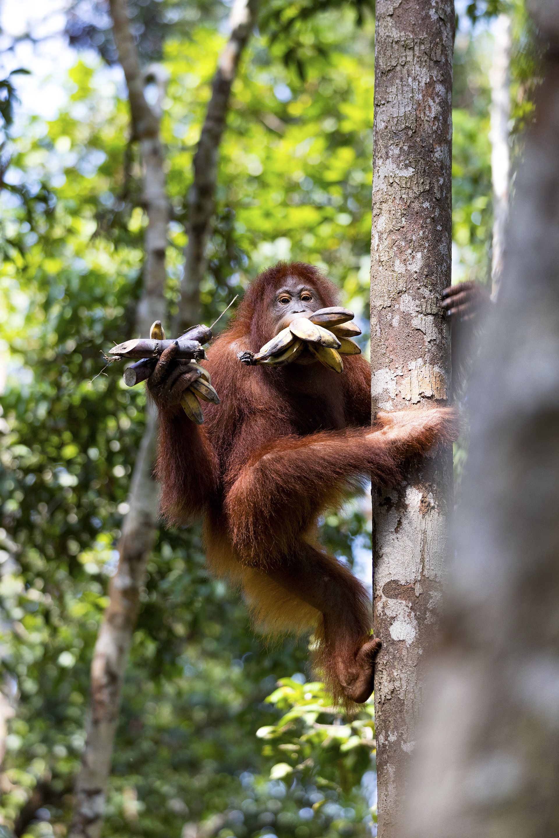 印尼丹戎普丁国家公园,一只红毛大猩猩嘴里塞满香蕉,爬到一棵树上,偷偷地享用他的战利品。这只贪婪的小猩猩叼着九根香蕉爬上了40英尺高的树上,手里还拿着另外两根香蕉。这只猩猩生活在丹戎普丁国家公园,这里为失去父母、受伤和获救的猩猩提供庇护。