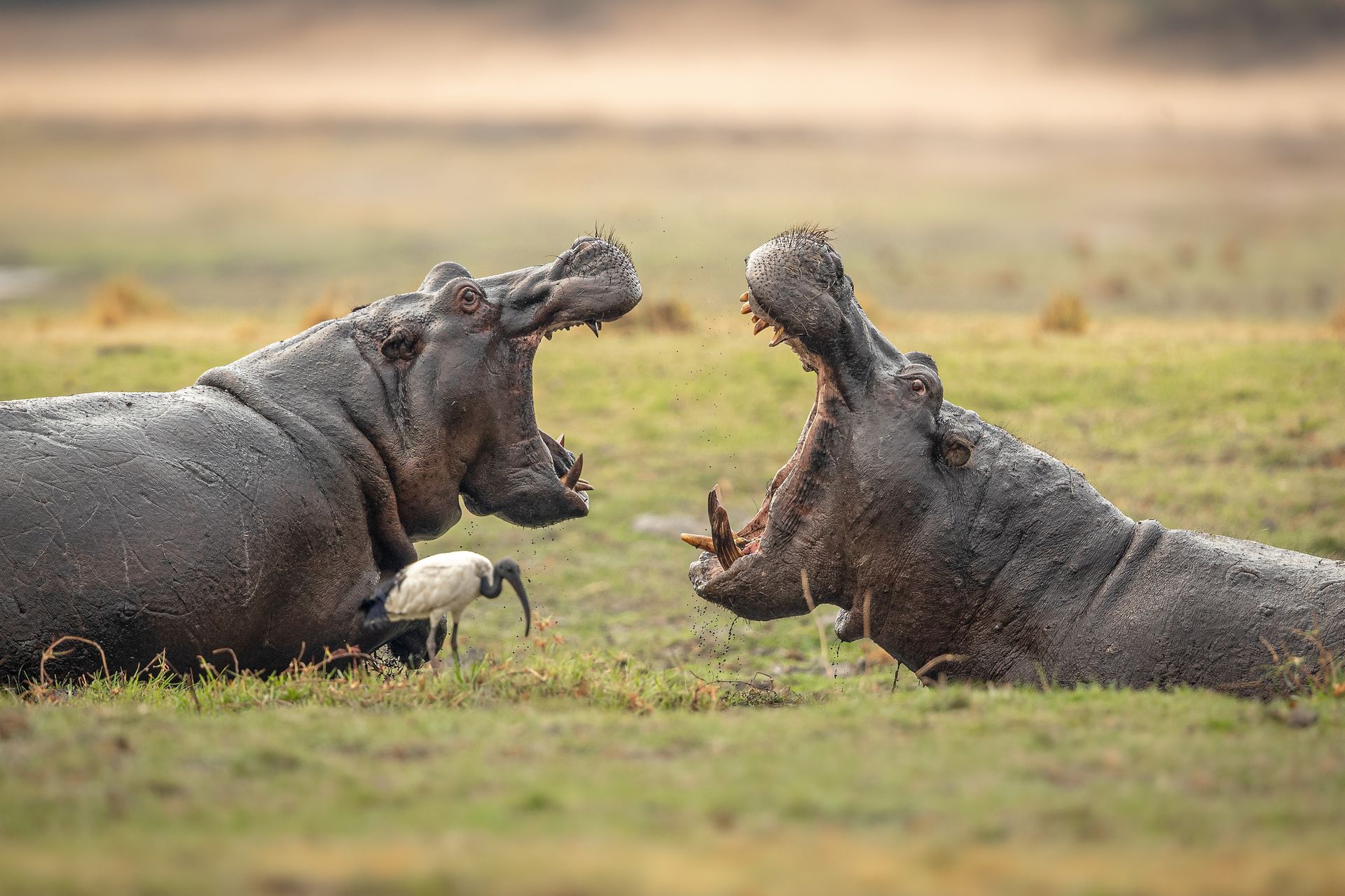 博茨瓦纳邱比河,大河马准备与同伴打斗,张开自己的大嘴展示下颚的尺寸和力量。河马经常为了求偶对象和领土而争斗,它们张开宽大的下巴以表明自己的统治地位。河马通常重2,000公斤,被认为是非洲最危险的动物之一。