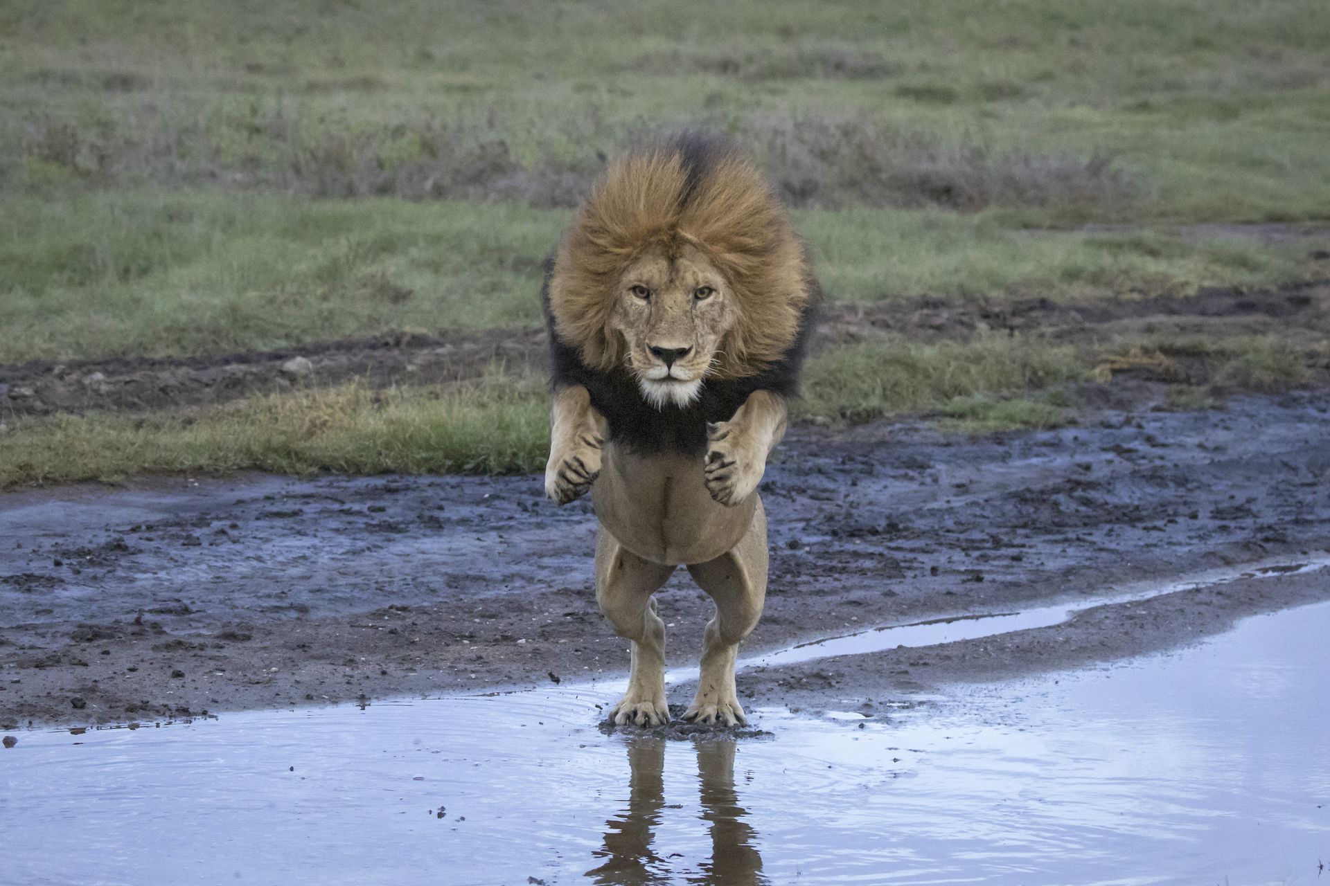 坦桑尼亚塞伦盖蒂国家公园,一头巨型狮子为了避免将爪子弄湿,跃过一条小溪。这一捕猎者敏捷的跳过两米宽的浅水,它能够长到600磅重。