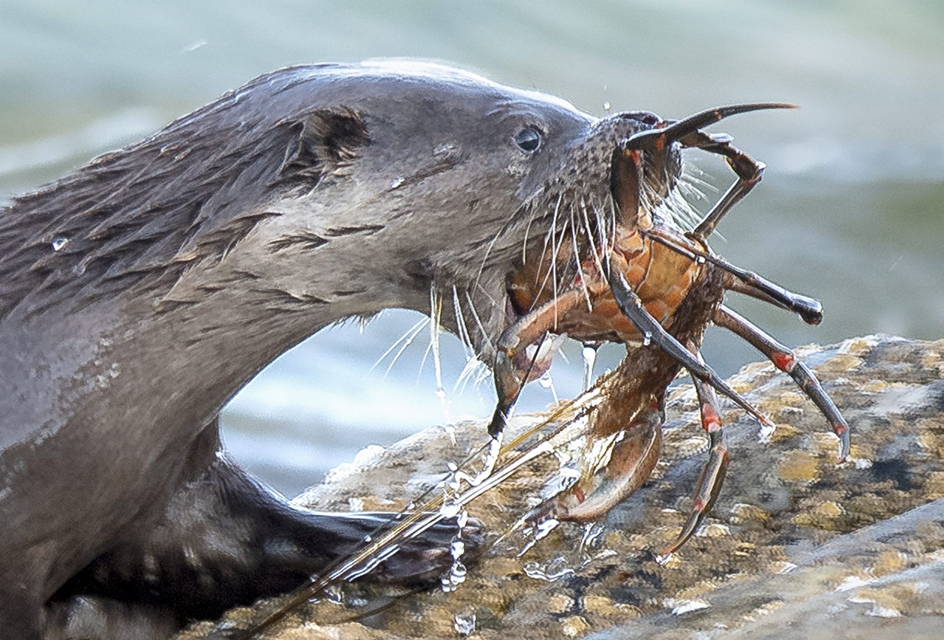英国苏格兰比特岛,一只水獭在游向罗思赛海岸时,嘴里塞了一个大螃蟹。当地人David Mercer表示:“这只幼年水獭正在炫耀它捕捉螃蟹的正确方法。我看过这只水獭好多次的捕食经历,它将螃蟹带到岸边,然后把蟹壳从上面揭下来扔掉,开始享用里面的螃蟹肉。”