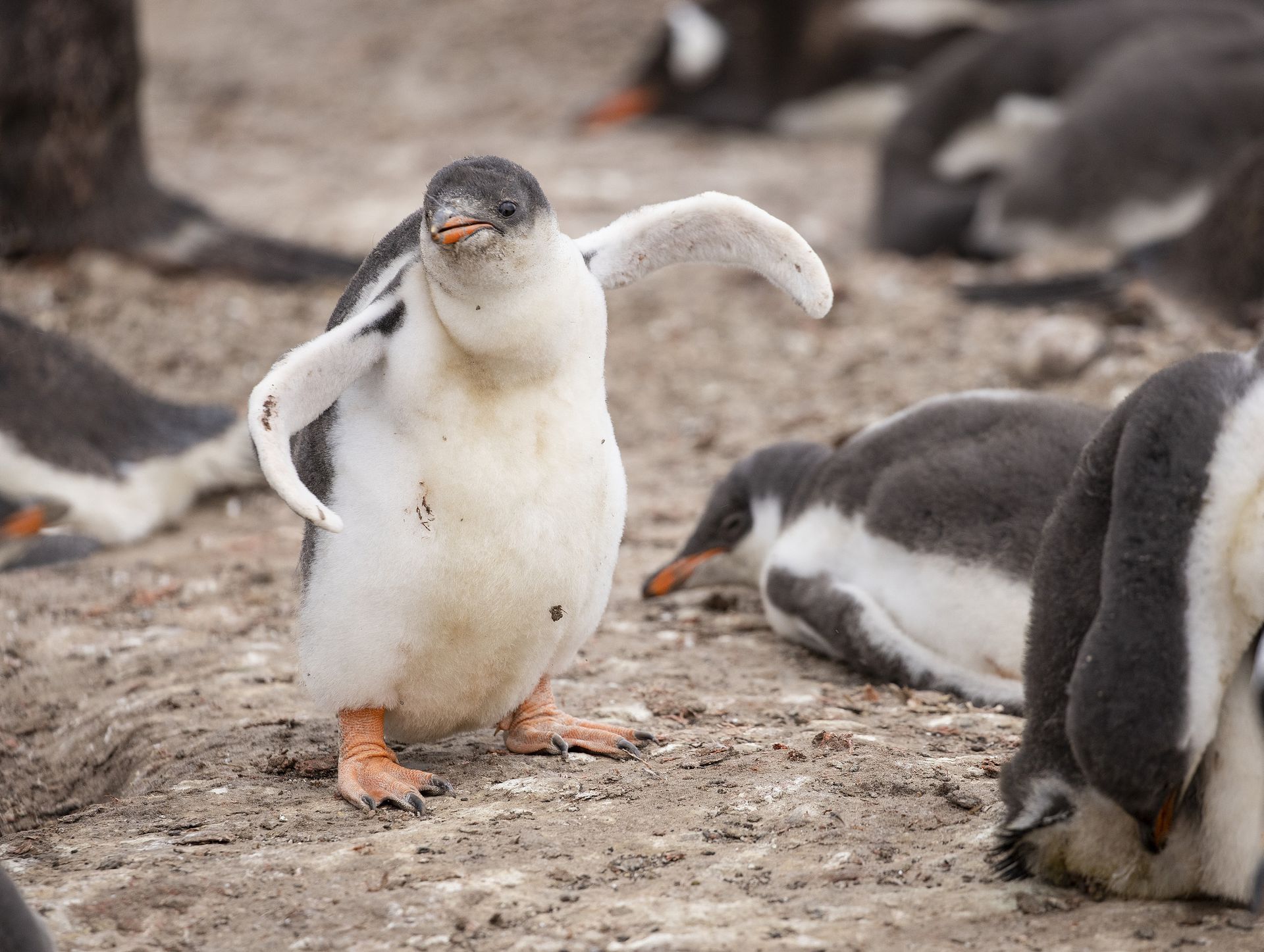 英国福克兰群岛海狮岛,年幼的企鹅聚集在一起学习使用四肢,这些6周至7周大的企鹅正在锻炼生存于恶劣环境中所必须的肌肉。福克兰群岛拥有4000对繁殖的巴布亚企鹅,51岁的业余摄影师David Higgins拍摄到这些照片。他表示:“海狮岛是我去过的最好的野生动物保护区之一。”