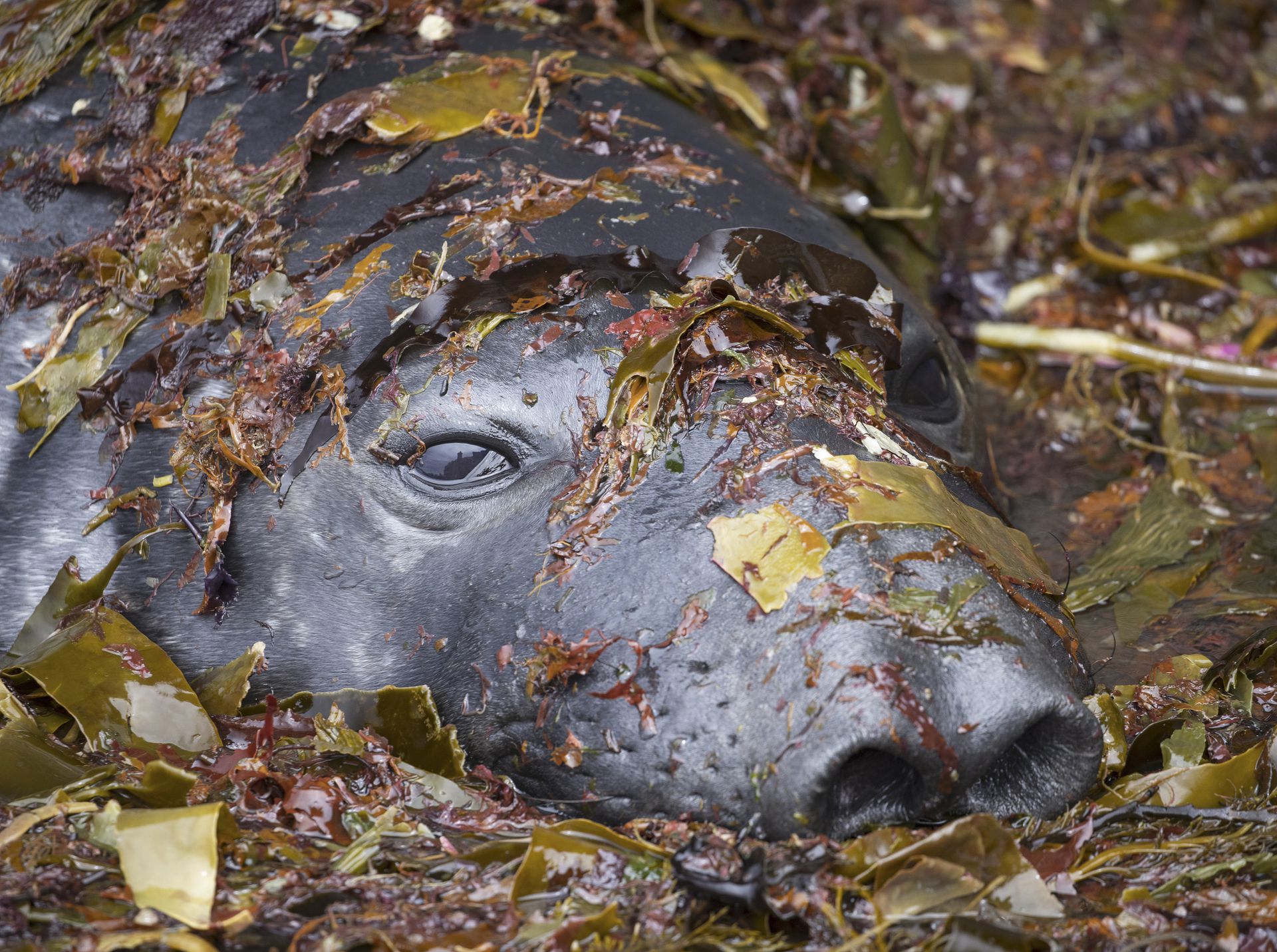 马尔维纳斯群岛,一只海豹藏身海草中,它被发现潜伏在虎鲸池里,虎鲸以它们为食。它可能在与其他海豹发生冲突后休息,几分钟后从伪装的位置出来。