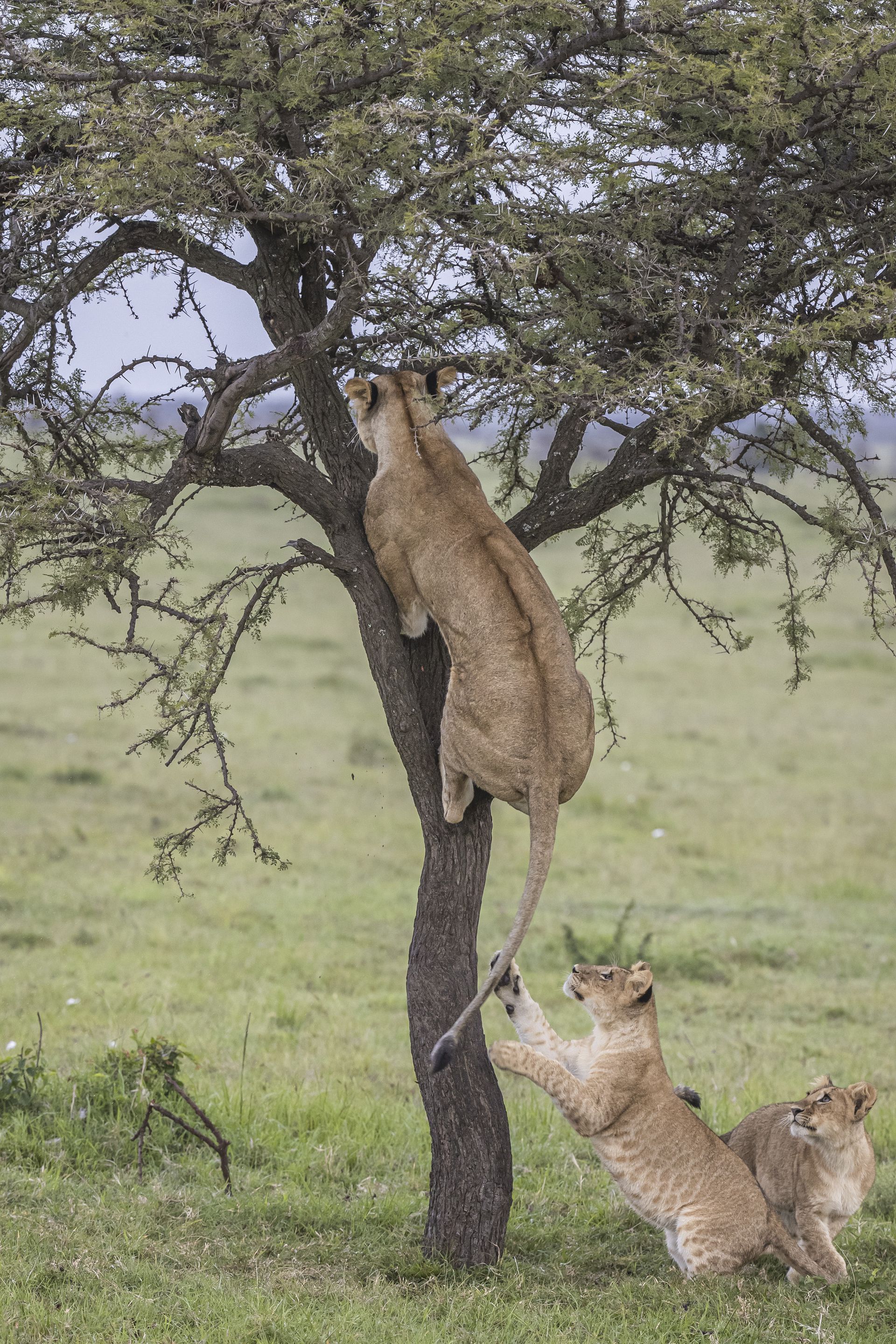 一群肯尼亚狮子争抢着将一棵树当游乐场,场面十分滑稽。幼狮和稍大的少年狮子争相往树上爬,而另外一头雌狮爬到了树杈上,小家伙们则在树下观望。