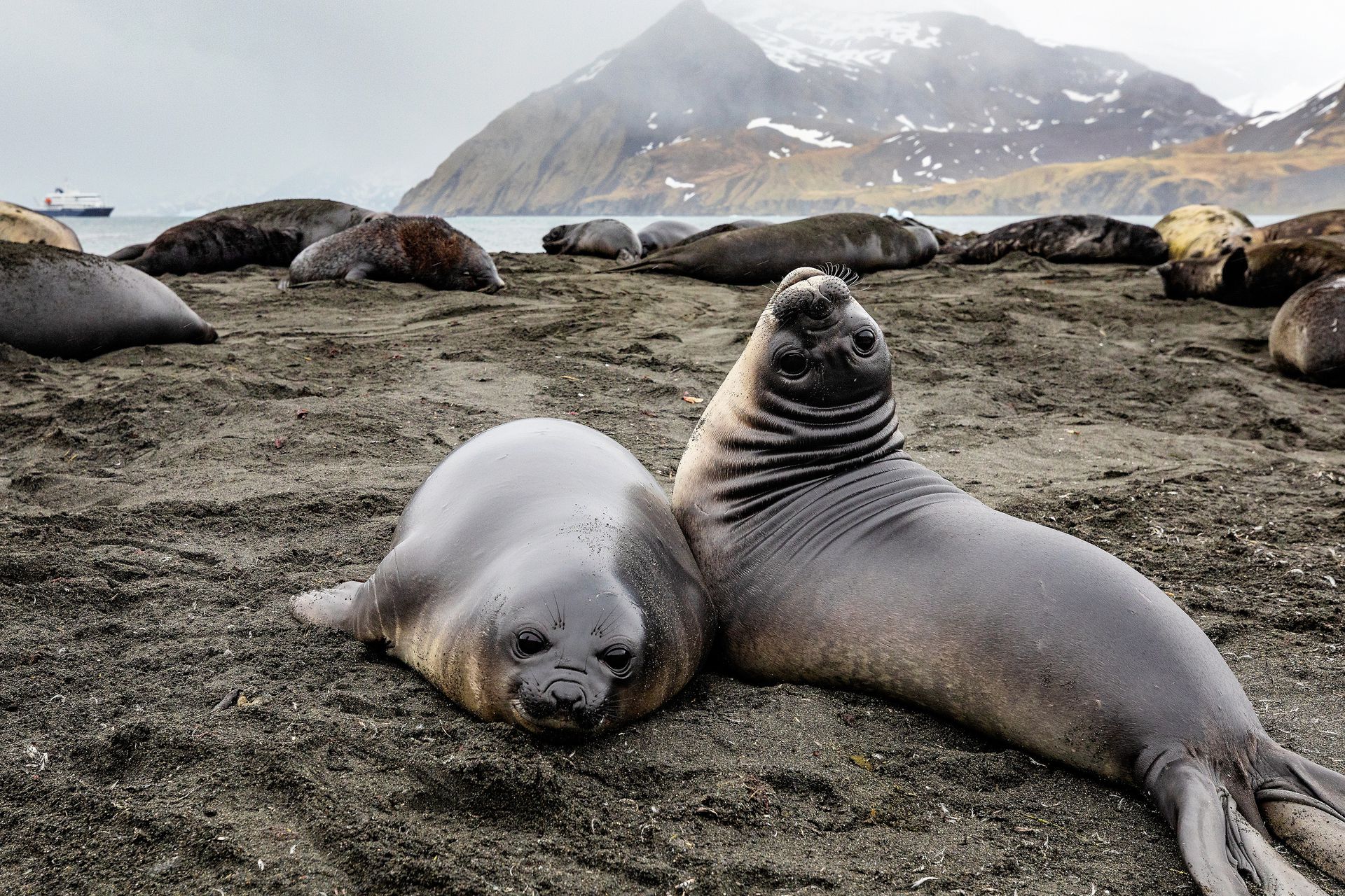 南极洲海岸旁南乔治亚岛,一只海豹把它的头倒过来看着走近的摄影师。摄影师Leighton Lum表示:“这些海象宝宝被称为小香肠,在这个年龄,它们想念它们的母亲,所以会依附任何奇怪地东西,寻找安慰和支持。我们必须继续前进,因为如果我们停下来,这些家伙就会走过来,试图依偎在我们身边。”