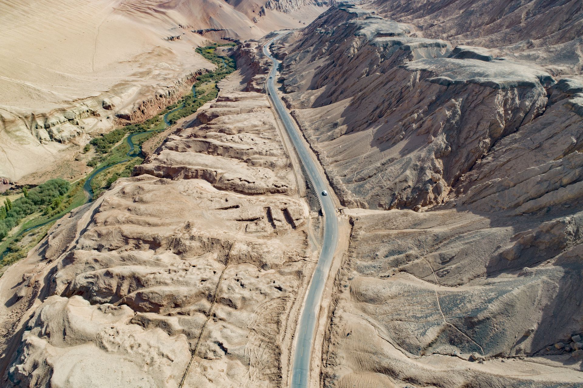 南疆路线包括乌鲁木齐、和田、喀什、阿克苏、库车、吐鲁番。图为新疆维吾尔自治区吐鲁番市,航拍镜头下的火焰山景区大峡谷。