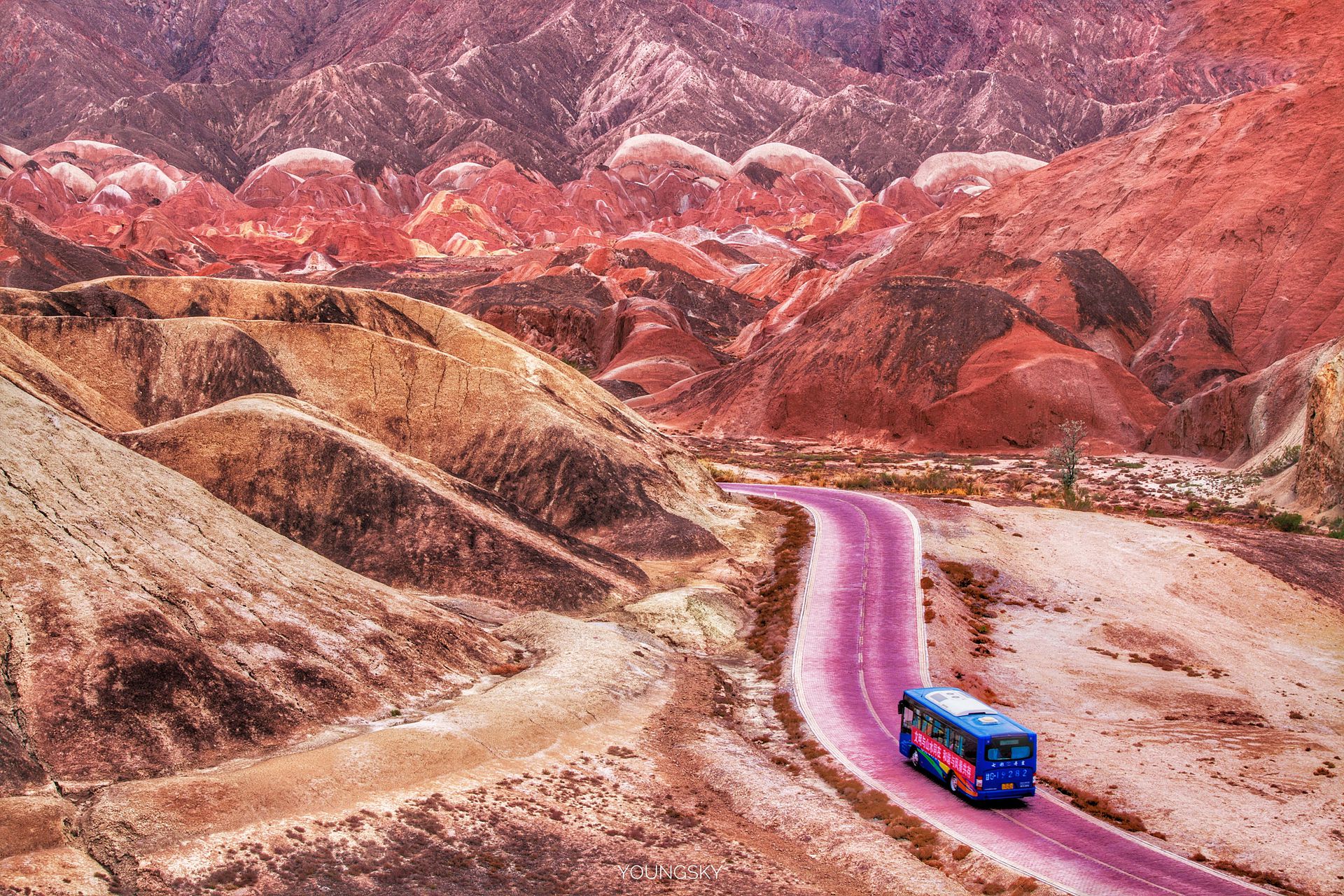 一辆大巴车路过甘肃张掖丹霞地质公园景区。