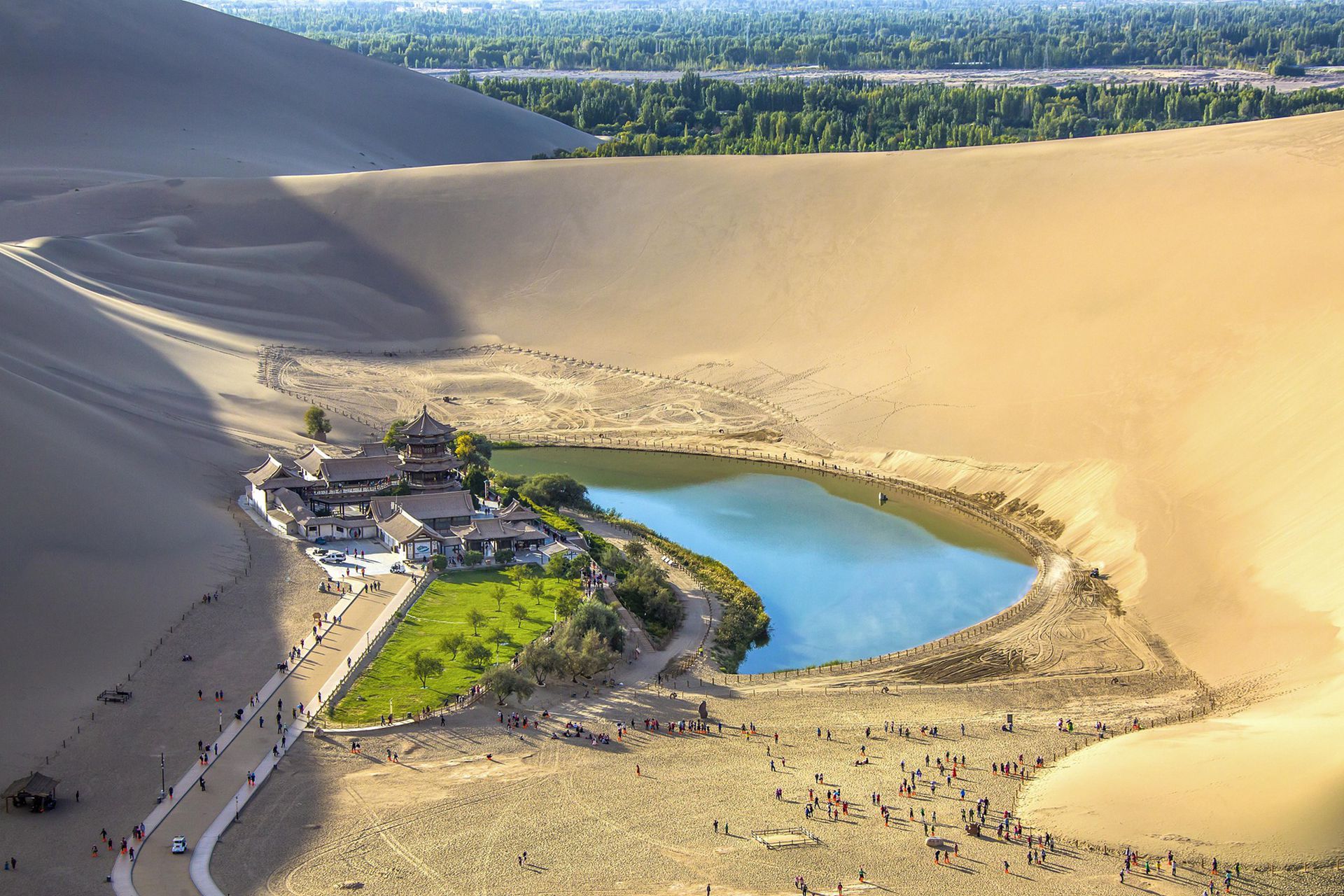 河西走廊路线包括兰州、西宁、环青海湖、门源、张掖、嘉峪关、敦煌。图为甘肃省敦煌市鸣沙山月牙泉风景区,游客骑骆驼畅游鸣沙山、月牙泉,欣赏大漠美景。
