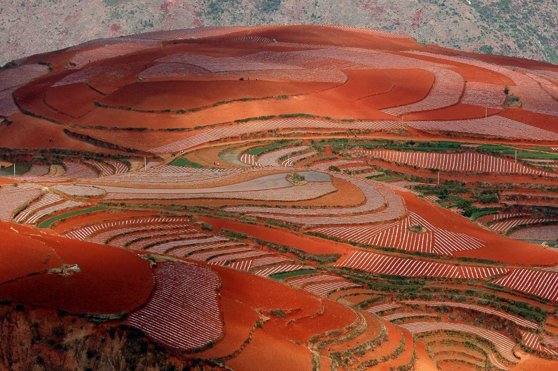 “东川红土地”位于昆明市以北偏东方向,属于昆明市东川区。因云南东川高温多雨下发育而成的红色土壤,这种土壤含铁、铝成分较多,有机质少,酸性强,土质黏重。